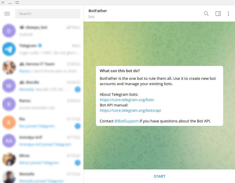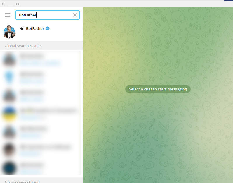 To build a Telegram bot with watife.com, first, open your Telegram App. Then in the search bar of the app, search with the ‘BotFather’ keyword. Then select the verified BotFather account.