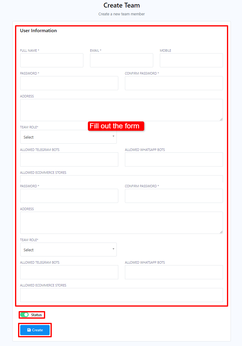 4. Fill out the User Information form. Enter your full name, email, mobile, password, address, team role, allowed telegram bots, allowed WhatsApp bots, allowed ecommerce stores.